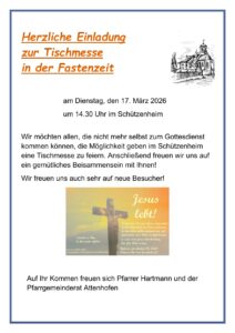 Herzliche Einladung zum Misereor-Gottesdienst um 10.00 Uhr im Claretinerkolleg, der vom Chor conTakt musikalisch gestaltet wird. Anschließend gibt es eine kurze Information und einen Film zum diesjährigen Projektpartner CODAS-Caritas, bevor um ca. 11.45 Uhr im Speisesaal das Fastenessen serviert wird. Es gibt traditionell Chilli con carne, auch vegetarisch, für Kinder auf Wunsch Spaghetti mit Tomatensoße. Bei einer Tasse fair gehandeltem Kaffee/Tee und Kuchen können Sie den Vormittag dann ausklingen lassen. Der Sachausschuss Mission/Entwicklung/Frieden freut sich auf viele große und kleine Gäste und bittet, um besser planen zu können um Anmeldung im Pfarrbüro, Tel. 07309/927660 oder Mail weissenhorn@bistum-augsburg.de bis Dienstag, 17.03.2026.