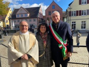 Am Rand des Leonhardiritts kam es zu einer Begegnung mit den Vertretern der Partnerstadt Valmadrera. Diese übergaben dem Stadtpfarrer als kleines Präsent eine Zeichnung ihrer Pfarrkirche und verbanden damit den Wunsch, sich das nächste Mal in Valdmadrera zu treffen.