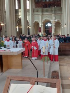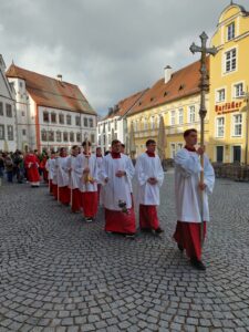 Am Sonntag feierten die Gläubigen aus der Stadtpfarrei Mariä Himmelfahrt mit den Kommunionkindern die Liturgie zum Einzug Jesu in Jerusalem. Diesmal begann die Palmweihe auf der Südseite der Kirche. Nach der Segnung der Palmzweige wurde das Evangelium von Jesu zum Einzug in Jerusalem verkündet. Im Anschluss zogen die vielen versammelten Gläubigen in einer Prozession um die Kirche und vom Turmportal in das Gotteshaus ein. Kirchenmusiker Matthias van Velsen umrahmte die Statio vor der Kirche. Von Mitgliedern der Gemeinde gefertigte Palmbuschen wurden zum Erwerb angeboten. Von den Kommunionkindern des diesjährigen Erstkommunion-jahrgangs waren erfreulicherweise viele gekommen. Mit ihren selbst gefertigten Palmbuschen haben sie den Stadtpfarrer und den liturgischen Dienst auf dem Weg zur Kirche begleitet, um dort miteinander den Sonntagsgottesdienst zu feiern.