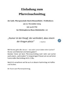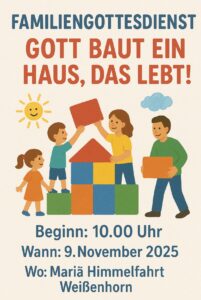 Das Familiengottesdienst-Team lädt alle – Groß und Klein – zum Gottesdienst am 9. November um 10 Uhr in die Stadtpfarrkirche ein: „Gott baut ein Haus, das lebt, aus lauter bunten Steinen, aus großen und aus kleinen, eins, das lebendig ist.“ Wenn Gott baut, wird sogar ein Haus aus Stein lebendig. Er errichtet kein kahles Gerüst, er baut ein Haus, das mit Leben gefüllt ist, für und mit allen Menschen. Denn jedes Leben, jeder Austausch, jede Begegnung braucht ein Fundament und noch vieles mehr…